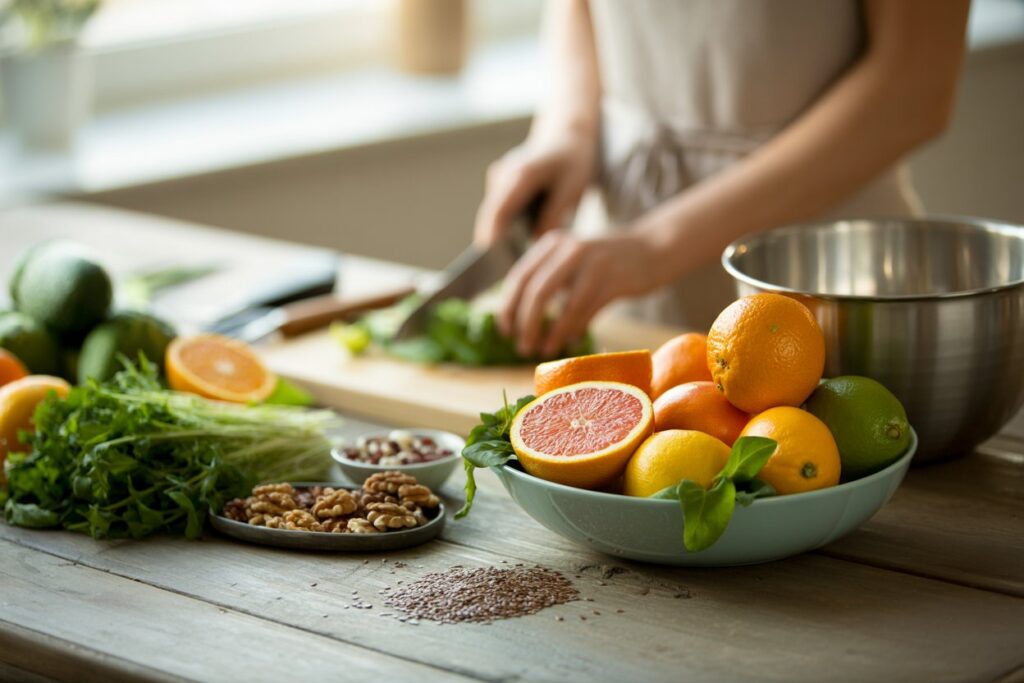 Incorpora alimentos ricos en antioxidantes: frutas cítricas, bayas, vegetales de hoja verde, frutos secos y semillas proporcionan los nutrientes esenciales que tu sistema inmune necesita para funcionar óptimamente.